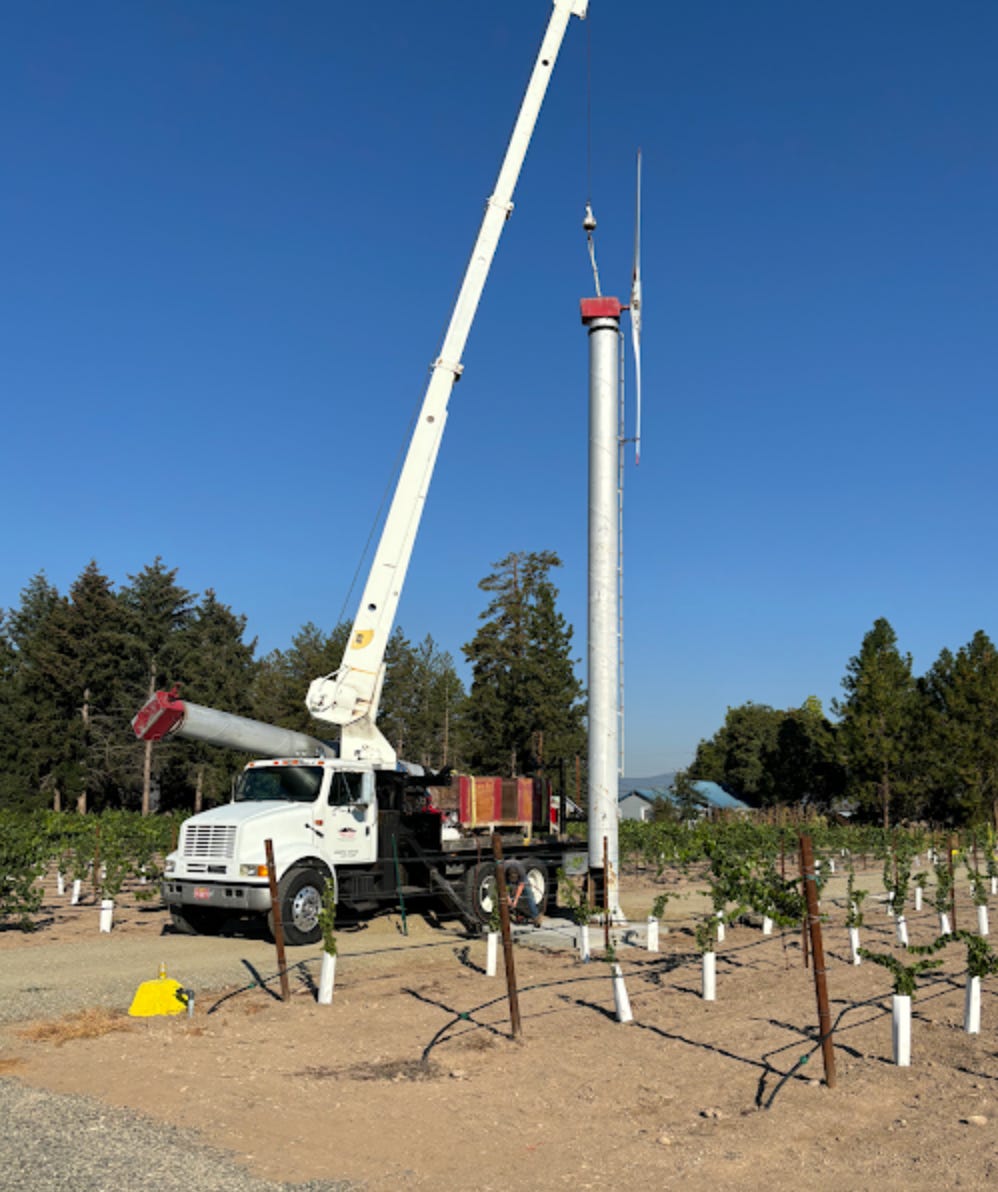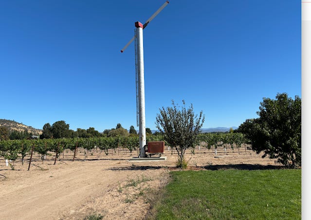 I still grow a few melons to eat and give away, but most of my attention has moved to the eight acres of grape vines I planted on the pumice-soil portion of my farm. My 60 acres are a piece of the 180 acres my great-grandfather, a veteran of the Union Army, purchased in 1883. I am installing propane-powered wind machines that stir up the air on mornings when temperatures drop into inconveniently-timed frosts. In the spring, frosts might damage new buds. In fall early frosts can damage grapes before they are ready to harvest. Cold air drifts down off the two Table Rocks on its way to the Rogue River and settles on the ground at my farm. My farm is a "cold" one, meaning it gets frosts when other places, those alongside slopes where the cold air drifts off, do not.