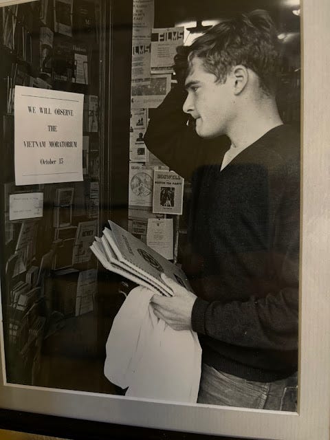 The "after" moment takes place primarily indoors, in classrooms, libraries, and then, in my adulthood, in offices wearing suits and ties. This photo was taken six weeks after the one above. I was in between classes, standing on Massachusetts Avenue in front of a tobacco shop, and a newspaper reporter asked me about the Vietnam Moratorium.