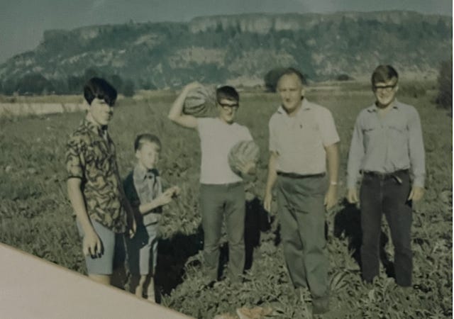 I am on the right. My father is next to me. My brother, David, holds the watermelons. Two cousins visiting from Syracuse, New York, are on the left.