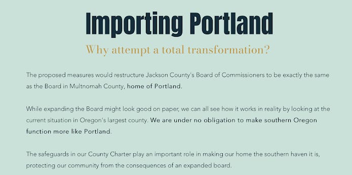 The ad says the Jackson County measures make Jackson County "exactly the same as the Board in Multnomah County, home of Portland." Hardly. The measures do add two commissioners, but Jackson County commissioners are all at large, rather than by district. Jackson County commissioner would be very unlike Multnomah's. Jackson County is moving away from Portland, if that is relevant to anything. Yet somehow that is a "total transformation" that is "importing Portland."